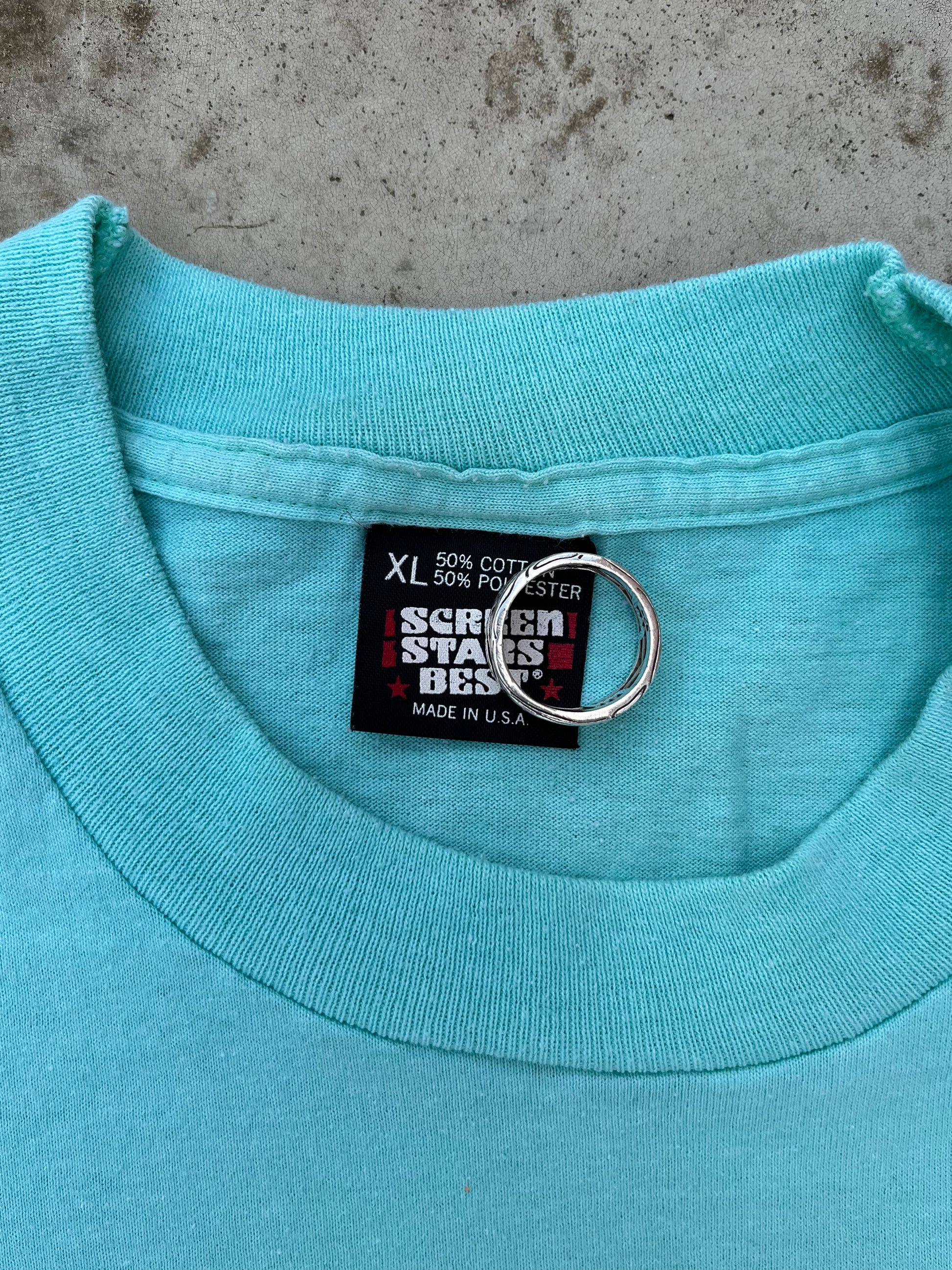 Introducing the vintage 1990's Unionville Elementary School single stitch t-shirt from Screen Stars Best! This classic tee is a true blast from the past, featuring the iconic Screen Stars Best brand and a vibrant turquoise color that is sure to turn heads.