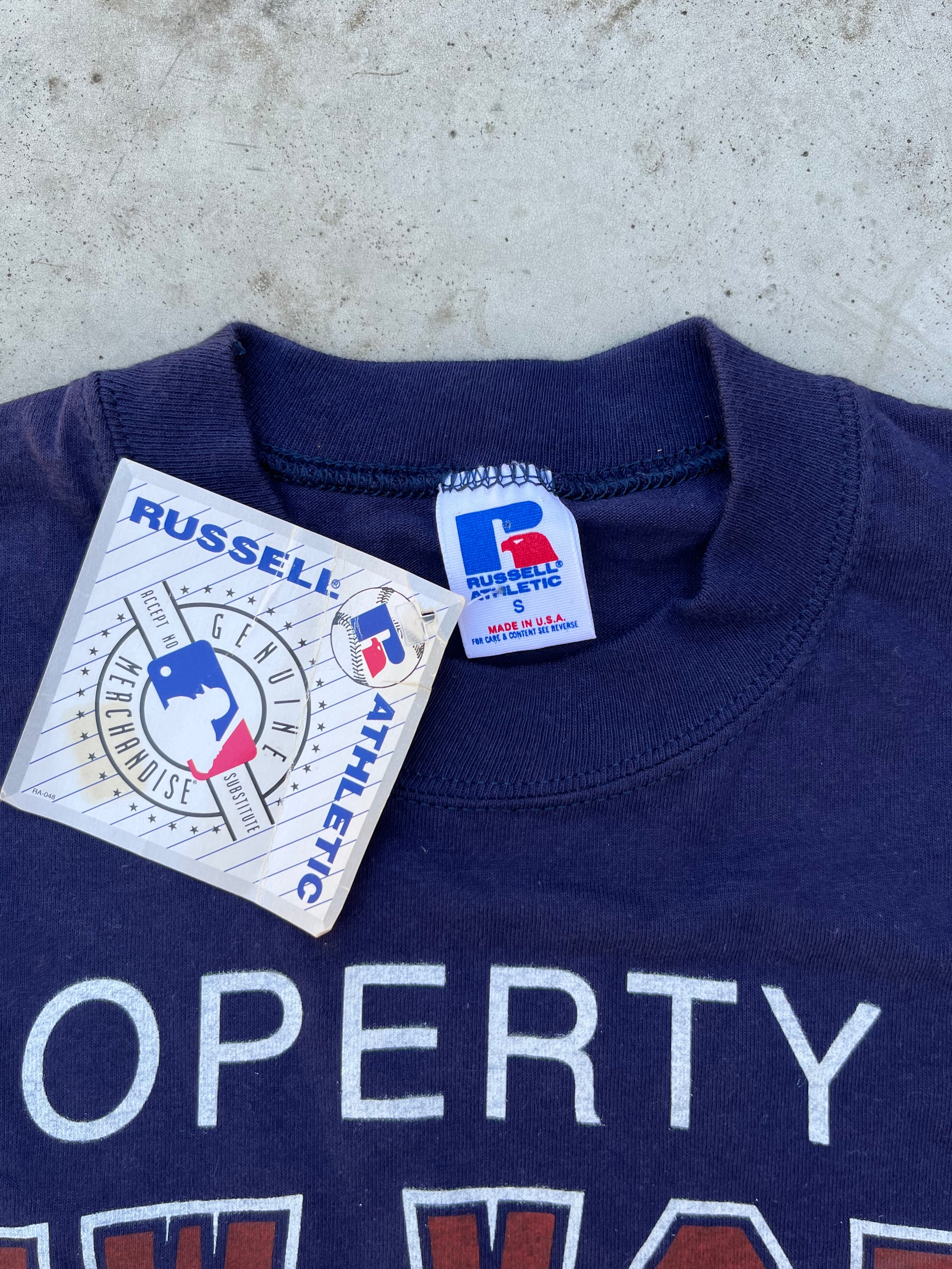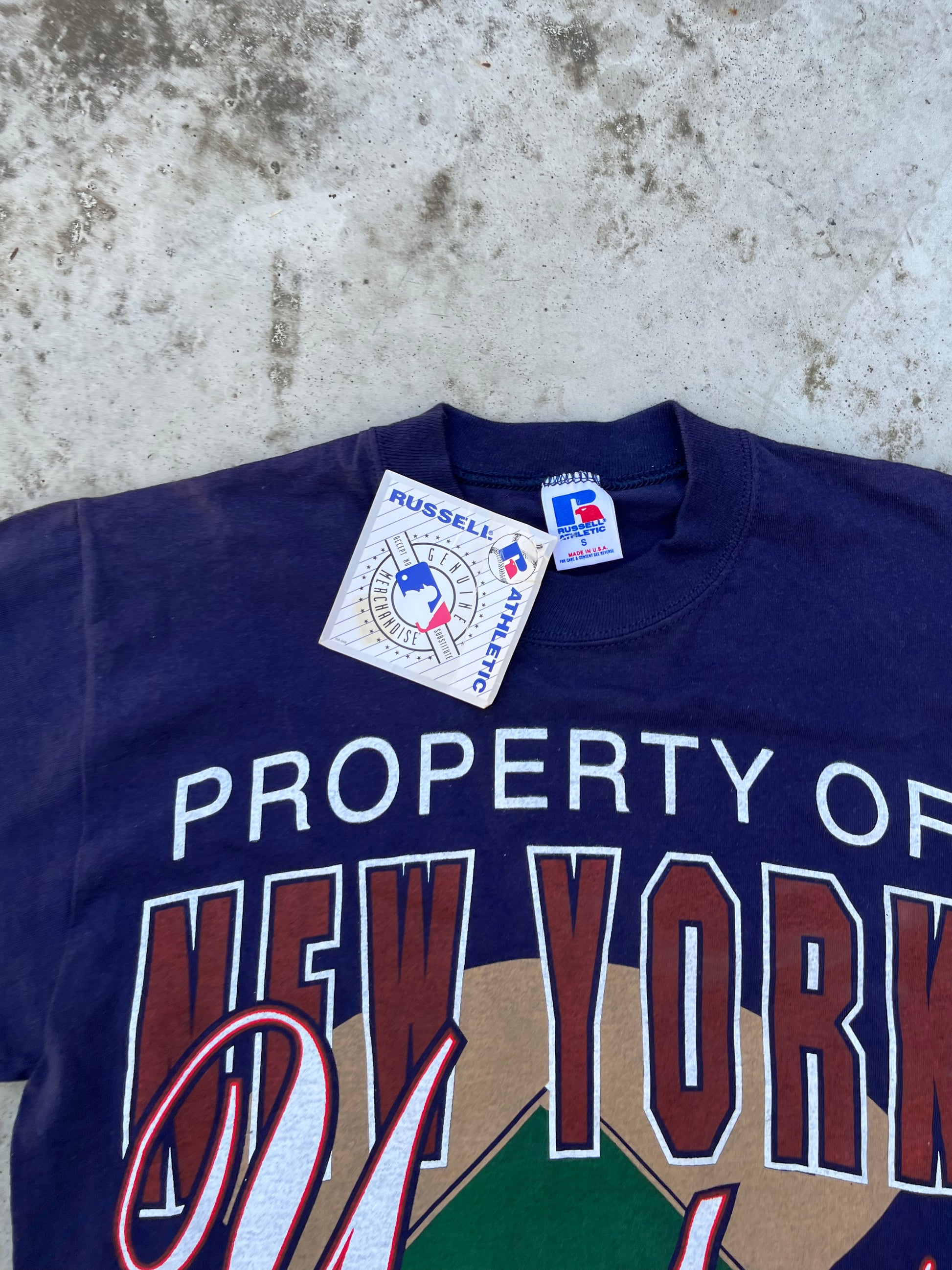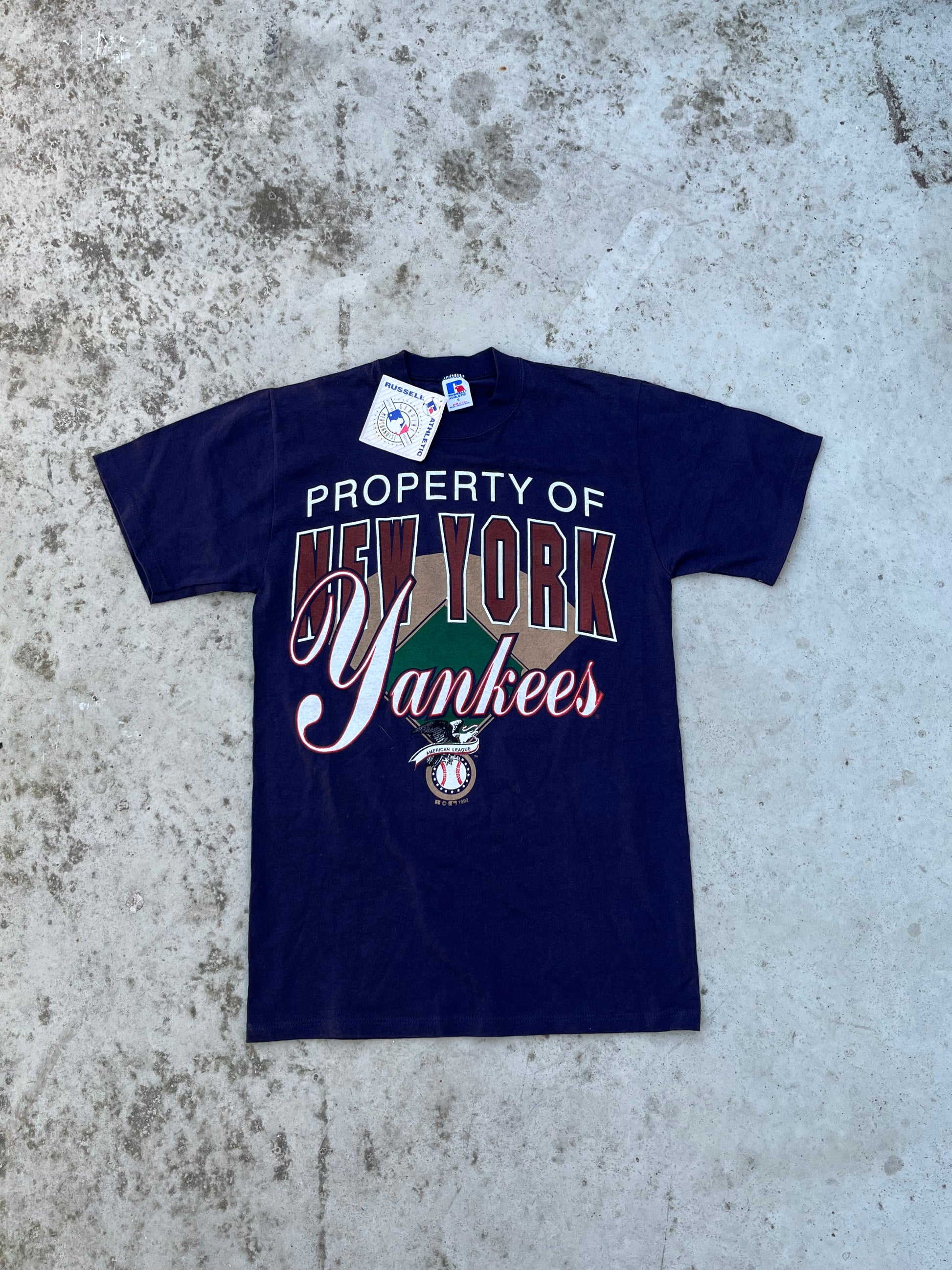 In summary, the 1992 New York Yankees Merchansize Tee shirt from Russel Athletic is a rare and brand new piece of vintage sports apparel. Its classic design, navy blue color, and iconic Yankees print make it a standout item in any wardrobe. So why not add it to your collection today and celebrate the legacy of one of the greatest sports teams in history?